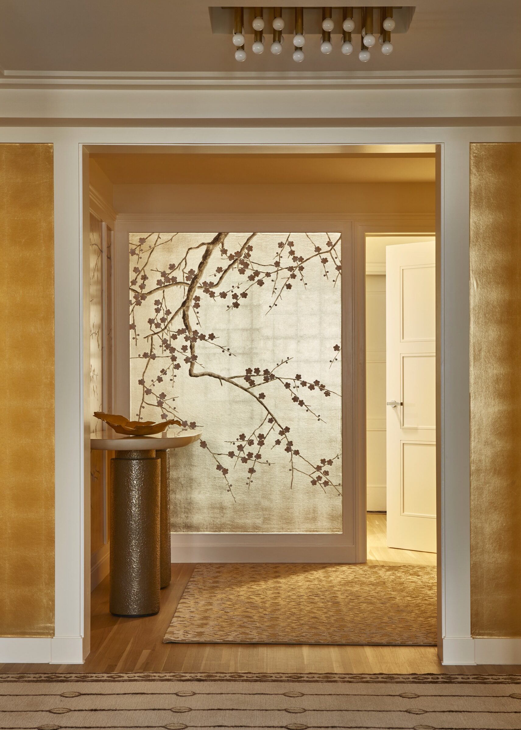 The carved limestone mantel introduces a new texture to the tone-on-tone fireplace wall in the living room. Swoon-worthy sofas from Lulu and Georgia and cocoon-like Danish shearling armchairs from 1st Dibs are made for lounging and arranged for conversation. Plump pillows in earthtones offer a dash of color while staying in the neutral zone.