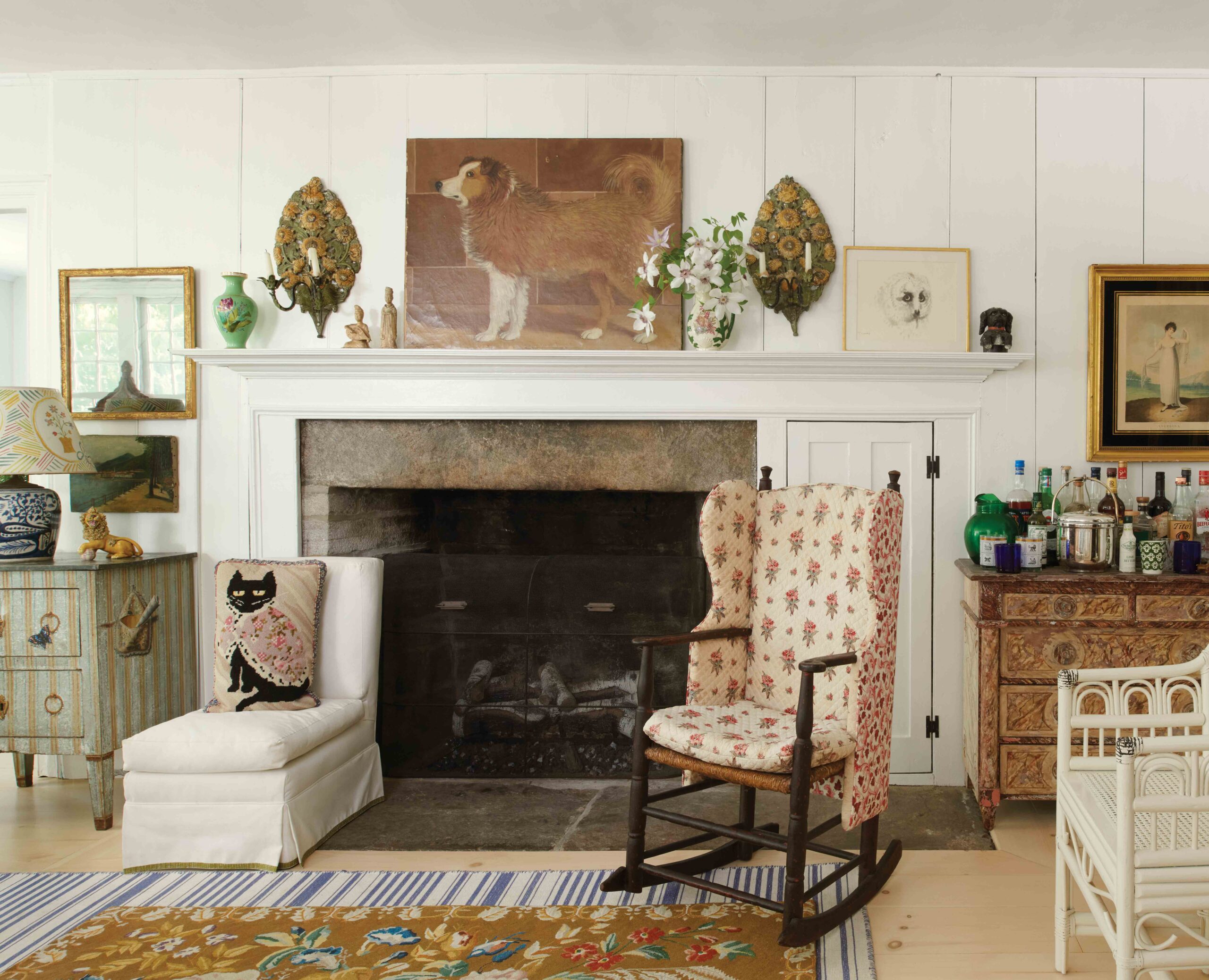 Crater loves to entertain around the fireplace, where the furniture and objects represent four generations: The rocking chair once belonged to her grandmother; the Van Day Truex owl painting resting on the mantelpiece was a gift from her mother, Apple Bartlett; and the floral rug was a gift from her daughter, Eliza.