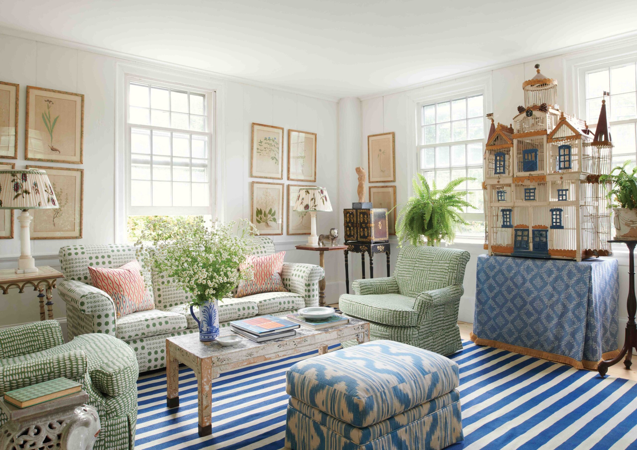 The Craters use the light-filled sitting room largely in the winter; the promise of spring surrounds them in the verdant textiles (Campobello and Albert Performance Fabrics by Sister Parish) and a collection of 19th-century botanical prints. A birdhouse given to Crater by her grandmother sits on a table draped in Sister Parish Pocantico fabric. The ottoman is a thrift-store find.