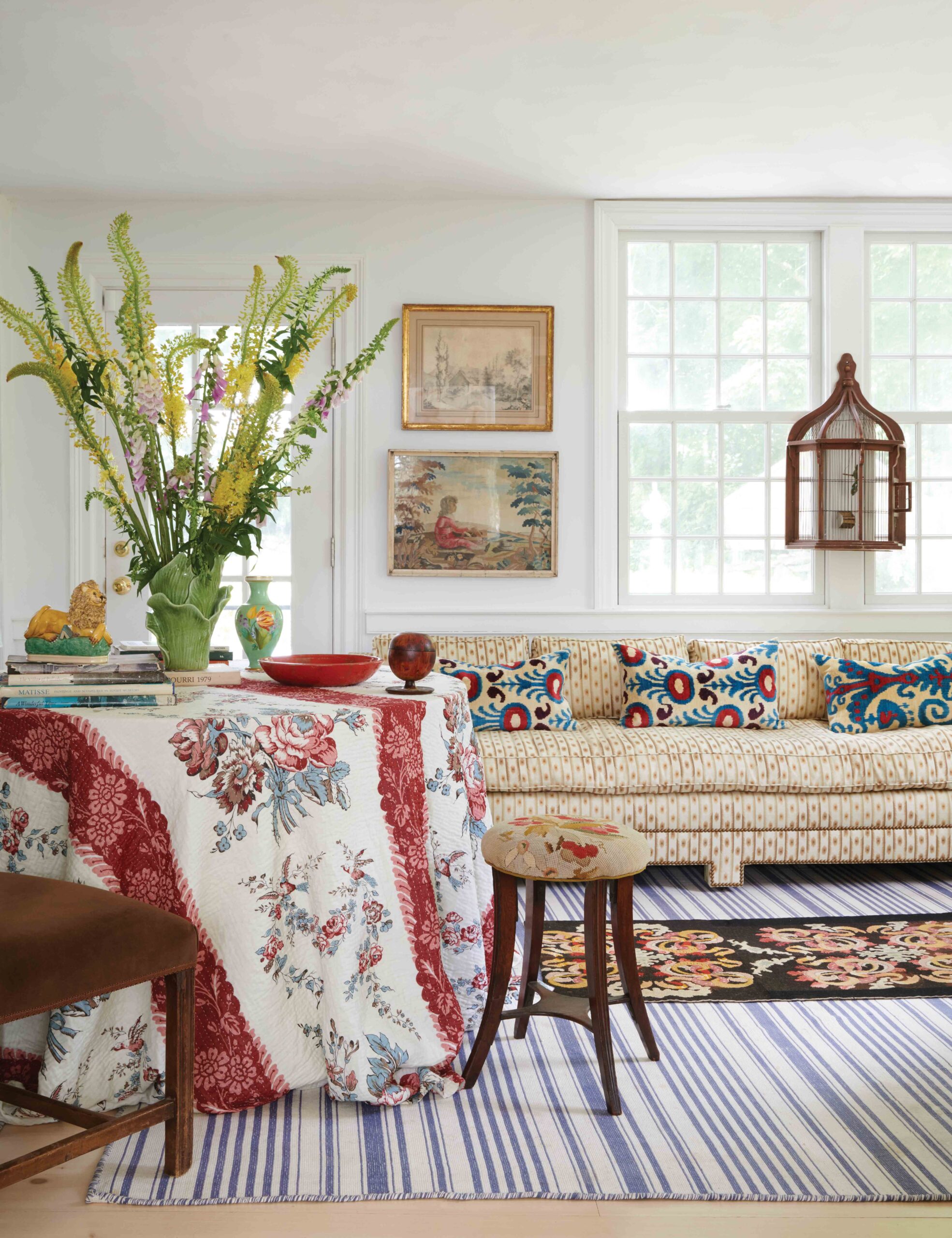 Max Kim-BeeBut they did turn the home into a laboratory for deploying new Sister Parish textiles and wallcoverings, which clad much of the 3,000-square-foot floor plan. “There’s nothing quite like trying new prints in a space where they are actually used, and not cheated just to get a photo,” says Crater. There’s the sofa in the light-filled sitting room, covered in jazzy Campobello, a patterned woven of Crater and Harris’s creation, inspired by the American folk-art quilts that Sister loved. La Fortuna, their rhythmic ikat stripe, stretches across an ample sofa in the living room, also known as the “long room” because it runs the width of the house. There are also plenty of Parish Hadley classics, like Dolly, which wraps a pretty downstairs bath, and Appleton, an Albert Hadley–designed print that greets visitors in the mudroom. And no home in the extended Parish family would look quite right without a good dose of ticking: It seemed the perfect choice for the guest room, where Crater’s mother, Apple Bartlett, often stays while visiting from her own house in Maine.