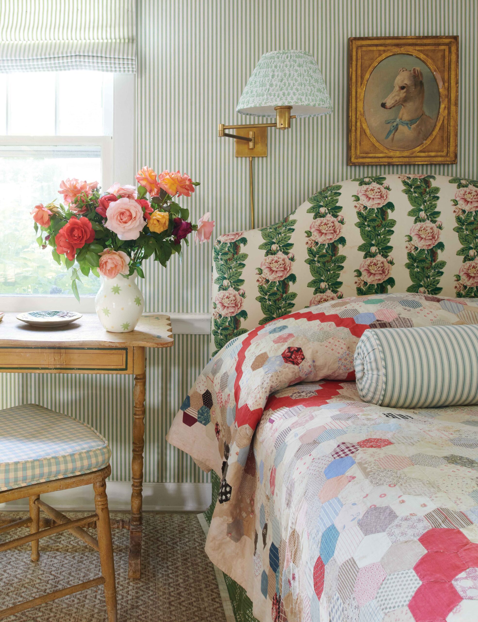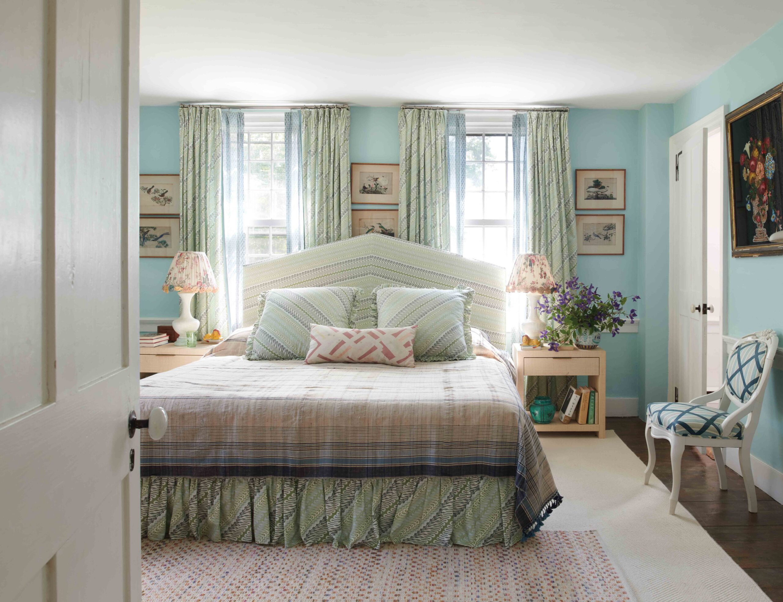 The primary bedroom was designed around a bias-striped fabric, Rees by Sister Parish, which appears on the headboard, bed skirt, and curtains. The painted Victorian chair is covered in Sister’s Stripe, a lattice print that Parish used for the curtains of her Maine dining room. Nightstands, RH Teen. Multicolored rug, Annie Selke.