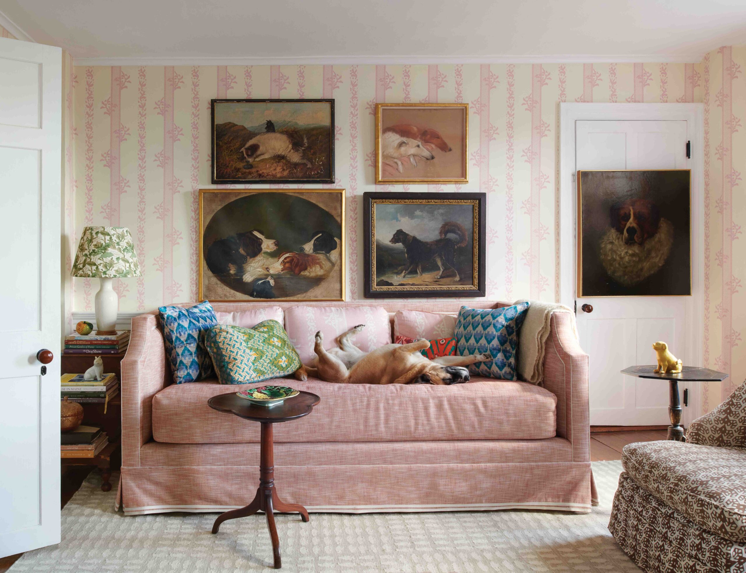 The walls of the TV room, affectionately referred to as the “dog portrait room,” are covered in Brio by Sister Parish; the pattern’s reverse is repeated on the pillows on the custom-made daybed, which is covered in Brother performance fabric and doubles as an extra sleeping spot for overnight guests (or Henry).