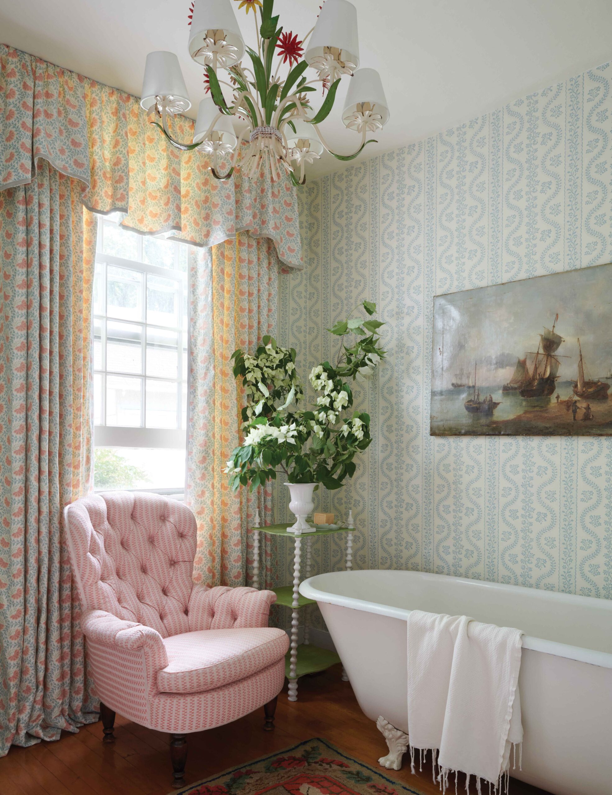 The bathroom was designed to channel “an English country house by way of Nancy Lancaster.” A trio of Sister Parish patterns—Dolly wallpaper, curtains in Verbena, and a chair in Hudson Woven—are complemented by a tag-sale chandelier. Crater’s husband, Doug, found the ship painting in a local antiques store.