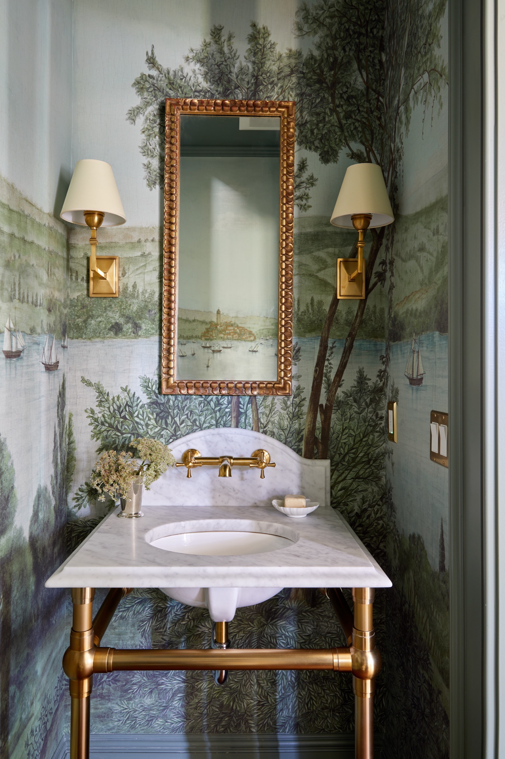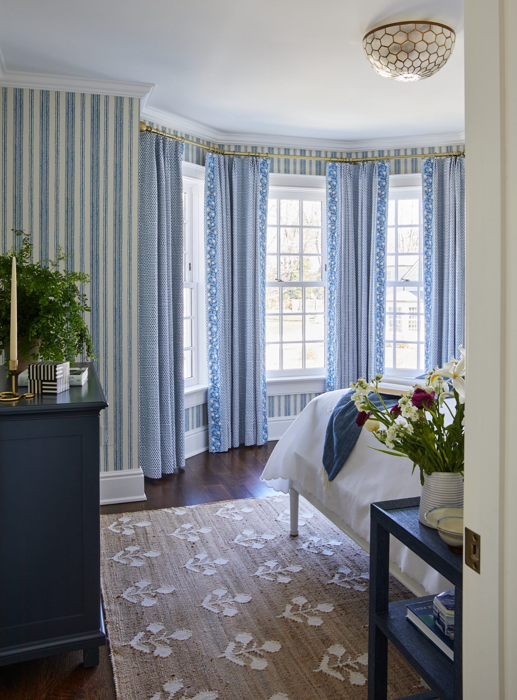 The guest room offers a lesson in pattern mixing, with its Sister Parish striped wallpaper, small-scale print on curtains, and neutral rug by Erin Gates for Momeni.