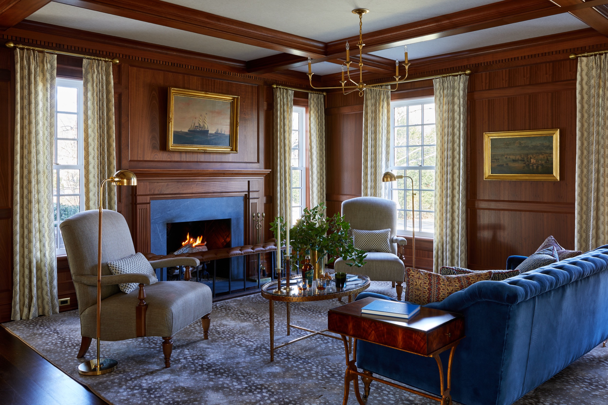 With its wood paneling, rich velvets, and leathers, the formal living room is the most traditional space in the house. A custom fireplace fender adds an English accent, while the outdoor-grade Stark carpet is durable enough to stand up to children. Soane Britain curtains provide a light counterpoint to the darker tones of the walls. Highland House sofa. Currey & Company chandelier.