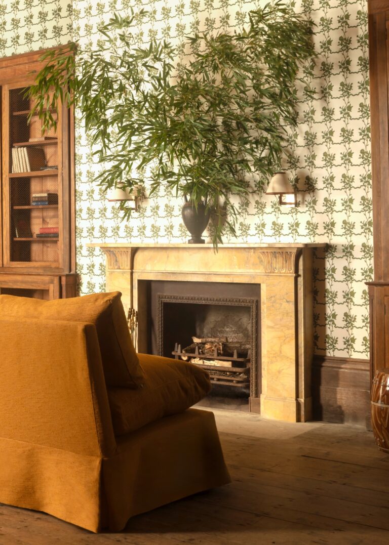 The Quadrille wallpaper and fabric pattern is based on a collection of 18th-century appliqué flowers from Soane’s archive. Posies of flowers are connected by an undulating ribbon to romantic effect.