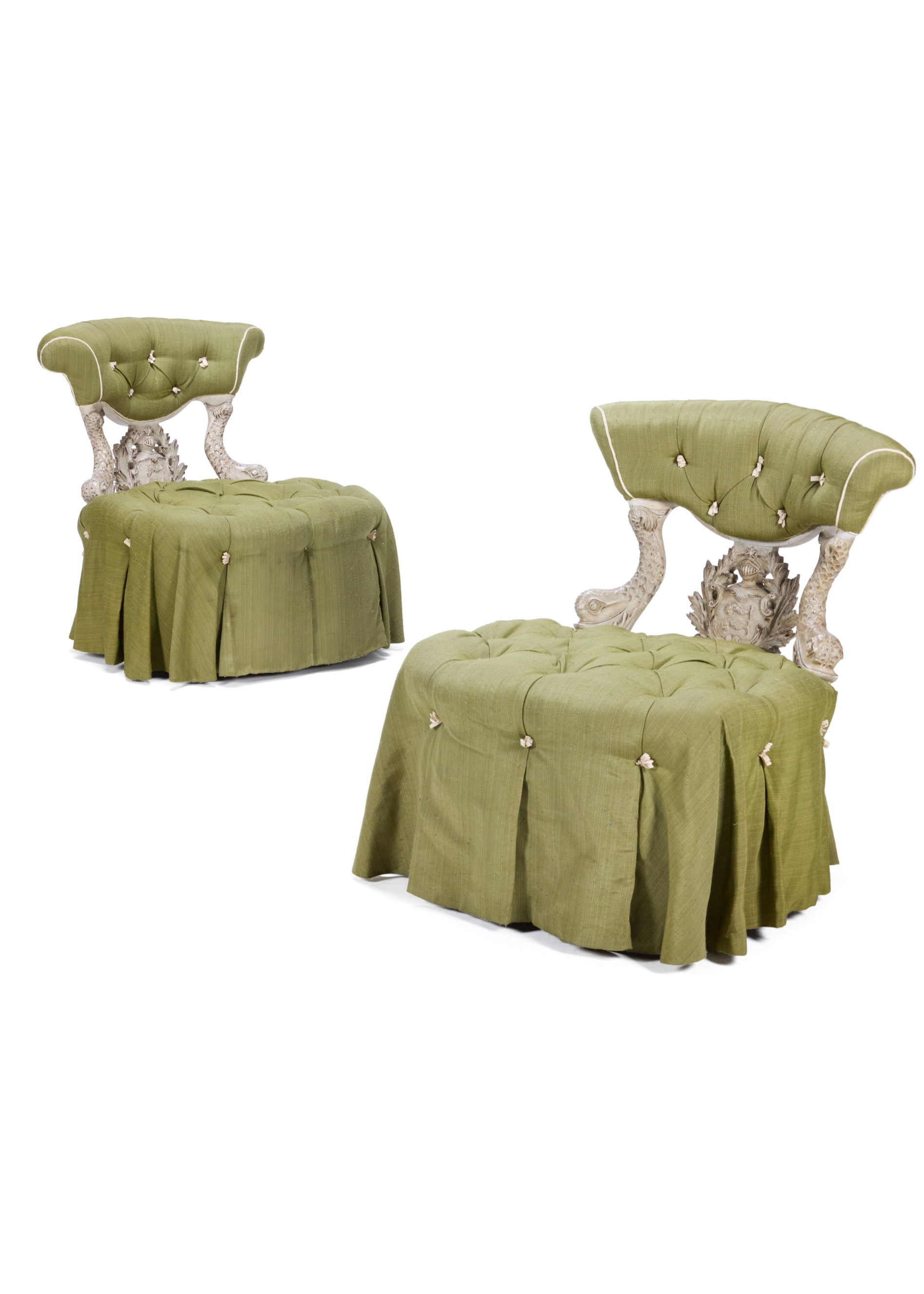 A pair of gray painted 'dolphin' chairs, circa 1930, upholstered in tufted and pleated green silk.