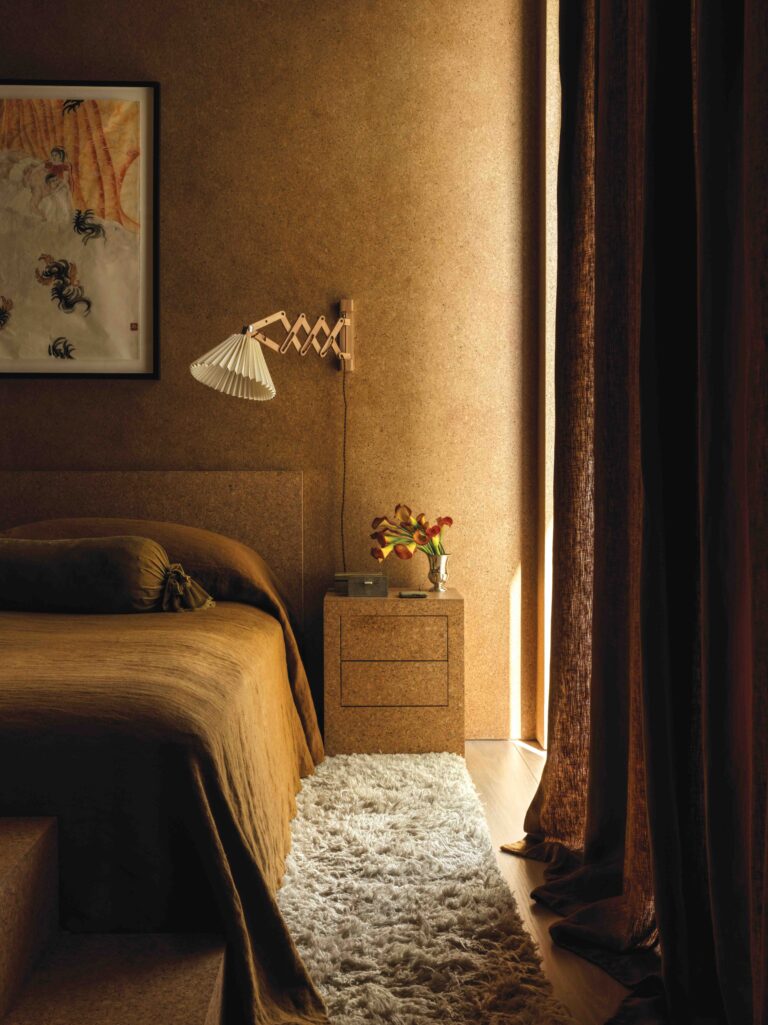 Adam Charlap Hyman transformed this Miami bedroom into a modern-day homage to Proust’s famous cork-lined room, swathing the walls, bed, and even nightstand in a Phillipe Romano wallcovering.