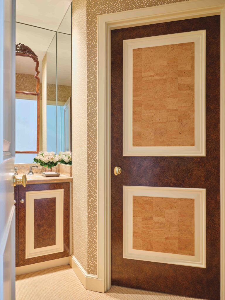 In a powder room with limited wall space, David Netto turned the doors into a focal point with faux- tortoiseshell paint and cork panels framed in high-gloss cream molding.