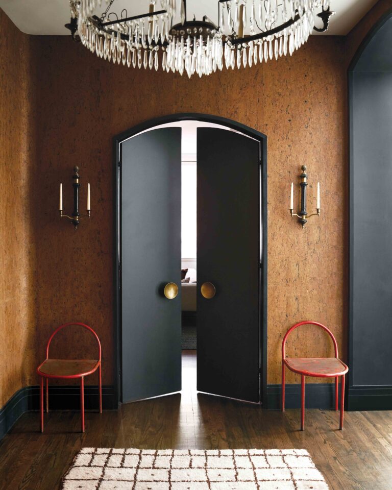 In Tatyana Miron Ahlers’s foyer in Manhattan, a deep tobacco cork wallcovering mutes sound while amping up tactility. “I love the texture, depth, and color—almost like burled wood,” says Ahlers. “It’s casual and elegant at the same time.”